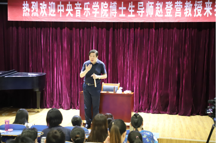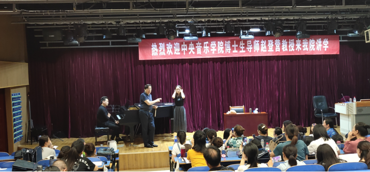 7月9日下午,应云顶国际vip.888邀请,中央云顶国际vip.888赵登营教授在艺术楼八音讲堂为参加音乐专业“双师型”教师培训的五十名学员上了一堂生动的声乐公开课。公开课由云顶国际vip.888副经理陈新宇主持。