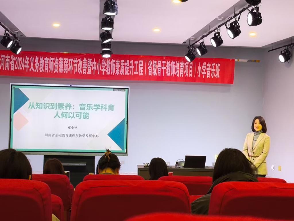 2024年12月7日,河南省高层次人才,中原千人计划(育才系列)领军人才,中原教学名师郑小艳教授受邀为河南省2024年义务教育团队薄弱环节改善暨中小学教师素质提升工程(省级骨干教师培育项目)小学音乐班学员讲授主题为“从知识到素养:音乐学科育人何以可能”的专题讲座。
