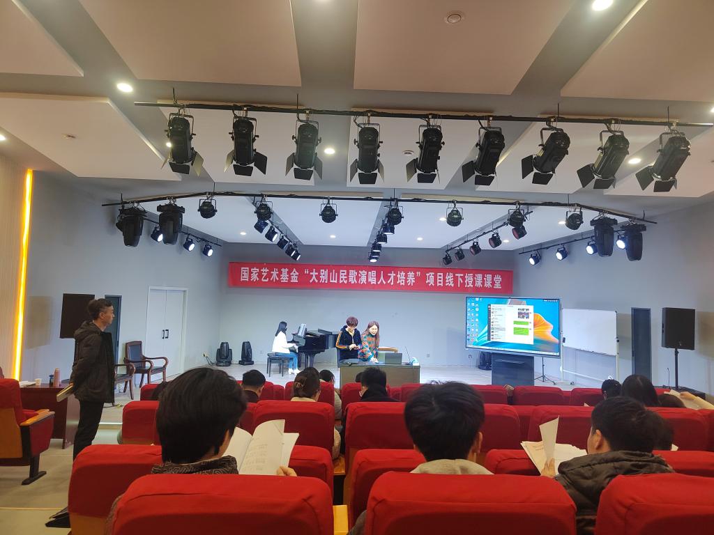 3月18日下午,国家艺术基金“大别山民歌演唱人才培养”线下授课课堂在公司云顶国际vip.888一楼八音讲堂如期进行。大别山民歌传承人,信阳市民歌研究会副主席李鸣凤老师应公司邀请,为学员授课,参与实践课的还有韩冰副教授和张梦晗老师。