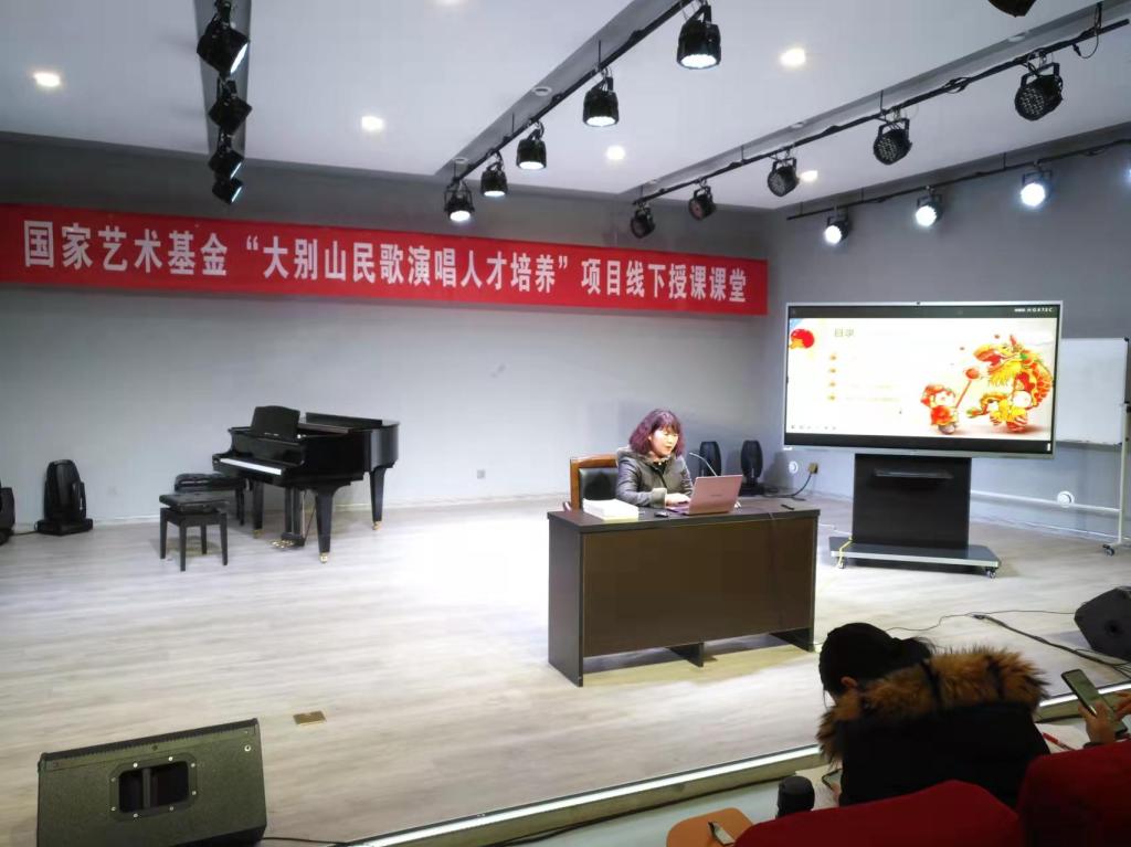 3月19日下午,国家艺术基金“大别山民歌演唱人才培养”线下授课课堂在公司云顶国际vip.888一楼八音讲堂如期进行。河南省非物质文化遗产(信阳民歌)代表性传承人、市级音乐骨干教师陈卉教师应公司邀请,在云顶国际vip.888一楼八音讲堂作了大别山传统民歌演唱专题的线下讲座,并由韩冰副教授主持。