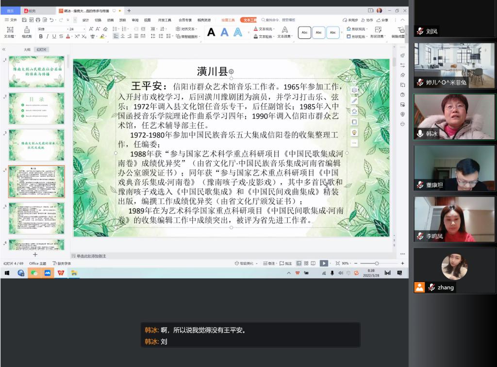 3月28日上午,国家艺术基金“大别山民歌演唱人才培养”项目在公司云顶国际vip.888继续开展。公司艺术硕士声乐演唱方向导师、声乐教研室主任韩冰副教授以《豫南大别山民歌的基层传承现状》为题进行课程。