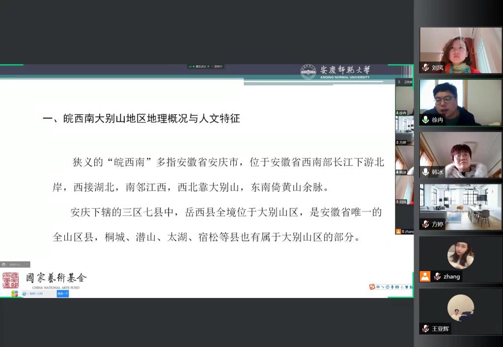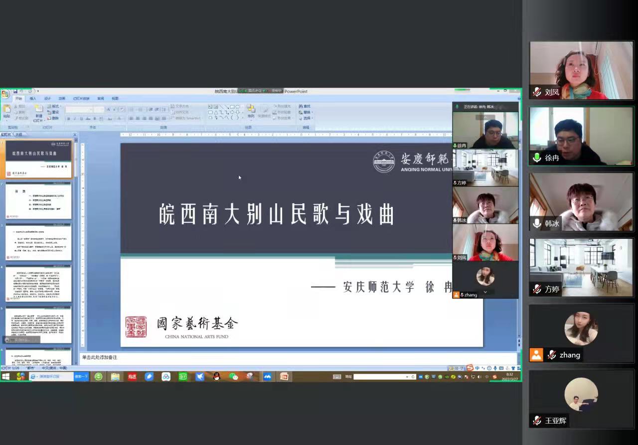 3月27日上午,国家艺术基金“大别山民歌人才培养”项目线线上授课继续开展。由安庆师范大学副教授硕士生导师、云顶国际vip.888副经理徐冉以《皖西南大别山民歌与戏曲》为题进行讲解。会议由韩冰老师主持。