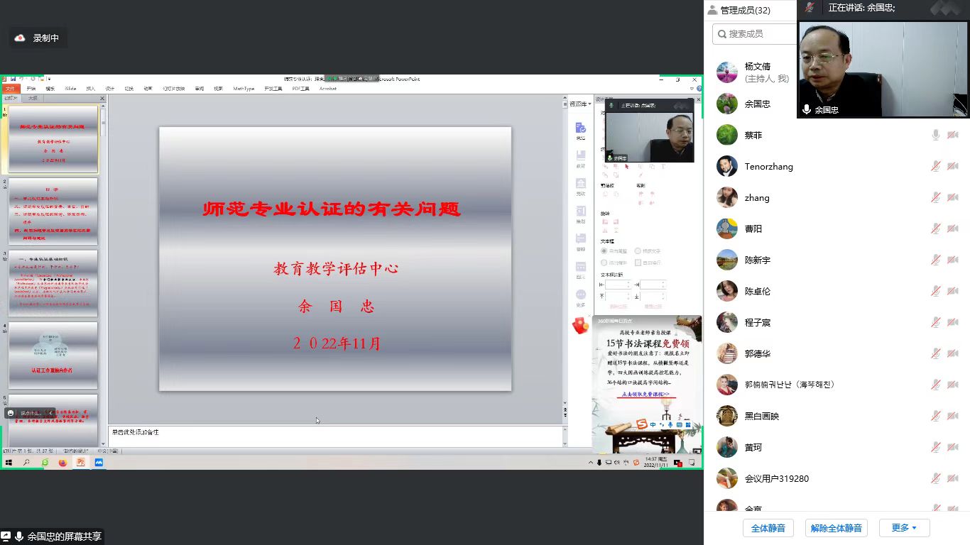 为更好地掌握师范类专业认证的相关政策,扎实推进公司师范类专业认证自评自建工作,11月11日下午,公司特邀请公司公司产品评估中心主任余国忠教授,线上开展师范专业认证有关问题专题培训。公司党委书记周文勇、经理陈新宇、副经理任远、党委副书记雷玲和师范专业认证工作小组成员参加了会议。会议由经理陈新宇主持。