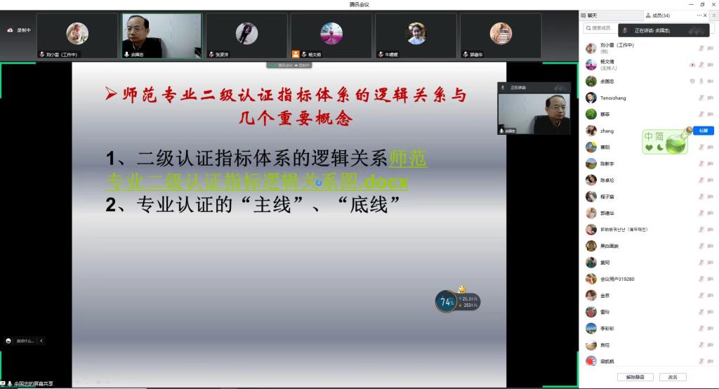 会上,余国忠教授从接受专家进校考查的视角,从专业认证基础知识、认证背景、认证宗旨、认证目的、认证理念、认证体系架构、认证程序以及公司师范专业认证目前存在的主要问题等方面做了细致讲解。他强调,师范专业认证要紧扣“一践行三学会”的核心要求,“保底认证”,“落细两线”,牢记“三个结构更新”“两个内涵递进”,对标国家师范专业认证指标体系,站位强师目标,切实做好三点工作:一是整改到位,突出“两线”和课程考核;二是系统进阶,重点关注毕业要求的达成;三是基于培养方案要求收集核心证据,关注毕业目标达成,不断提升师范生的培养质量。