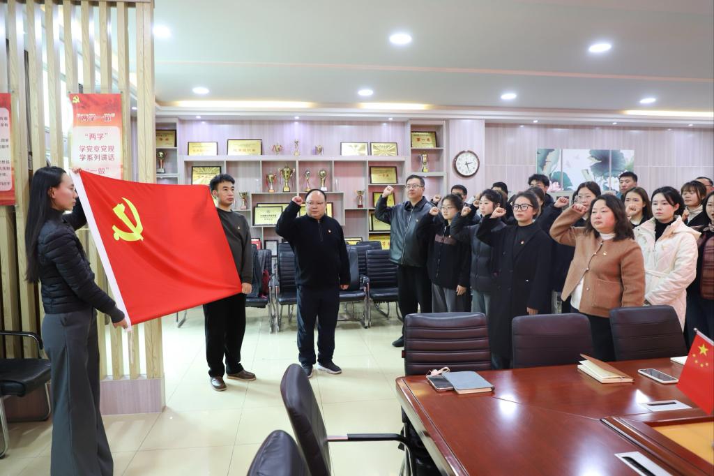 活动伊始,党支部举行了庄严的入党宣誓仪式。在任远的带领下,全体人员面向党旗,高举右手,庄严宣誓。铿锵有力的誓言表达了预备党员对党的忠诚和为共产主义事业奋斗终身的决心,与会老党员也在重温入党誓词中进一步坚定理想信念,激励了在场所有党员不忘初心,牢记使命。