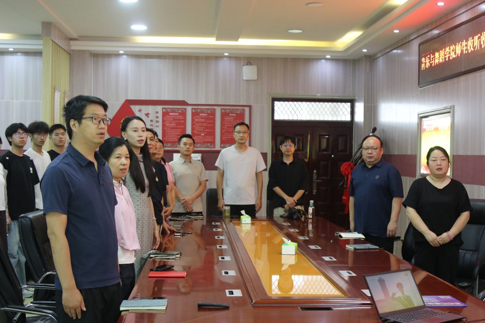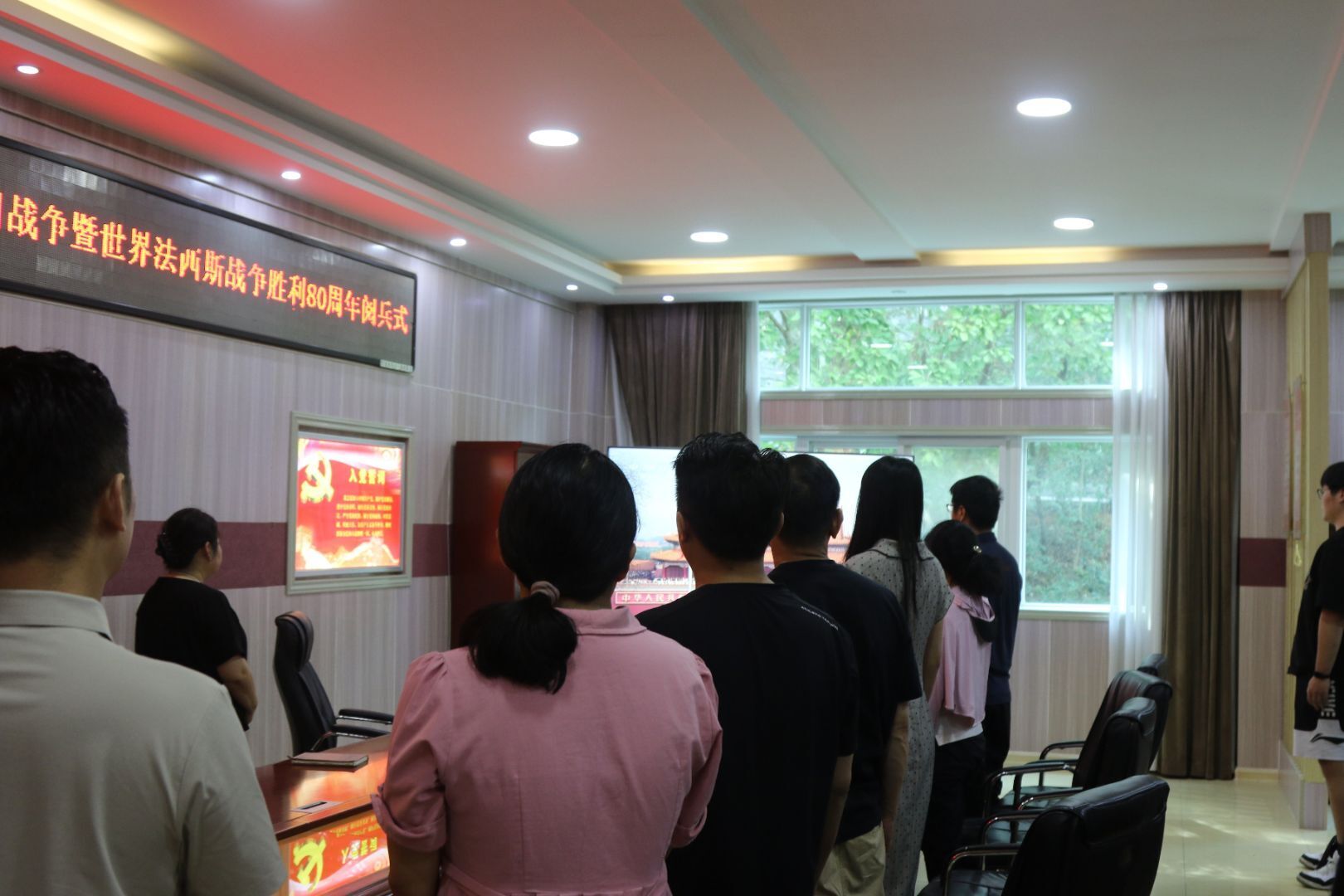 在艺术楼“党员之家”,师生党员代表们全体起立齐唱国歌,目光聚焦屏幕上天安门广场的盛大场景,共同感受强国强军的壮丽画卷。在教九楼,各班员工全神贯注,认真聆听习近平总书记发表重要讲话,深刻领会本次九三阅兵的重大意义。