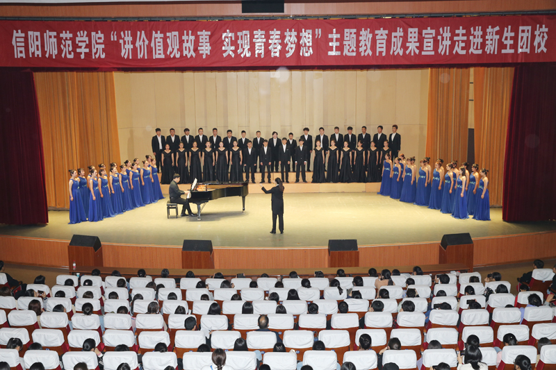活动开始前播放了讲价值观故事宣传片。在合唱《在灿烂的阳光下》中正式拉开帷幕。《一路向东》热情讴歌了红军战士大无畏的牺牲精神和坚定不移跟党走就能夺取革命胜利的坚强意志。《杜鹃花开烈女崖》用晏春山的故事突显了中华儿女为革命事业无畏牺牲的精神,深深表达了对革命先烈的敬佩和感激之情。《担当者》深情讲述了郸城县中学董事长张伟的感人事迹,教育引导广大青年团员向榜样学习,向模范致敬,要无私奉献。舞蹈《映山红》将活动氛围推向高潮。《心是大海,爱是朝阳》讲诉了盲人特教老师郭朝阳从教二十余年,身残情深、以爱执教,让盲童感受到家的温暖,引导员工健康成长,让人肃然起敬。《红田》讲述了赤诚的革命志士们为了革命事业英勇献身,并对取得最终胜利充满信心的英雄故事。《一颗红心永向党》讲述了革命先烈徐海东的一生,让全场师生深深体会到徐海东为党为国为人民的赤胆忠心。《梅生苦寒溢人清香》将公司刘梅生教授将满腔热情和忠诚献给教育事业、献给党的故事娓娓道来,让人心生敬仰。《红军干娘周家姆》《高干子弟》等一个个故事,教育引导青年团员要积极践行社会主义核心价值观,不忘初心,牢记使命,发扬艰苦奋斗的精神,坚定信心埋头苦干奋勇争先,努力把自己培养为德智体美劳全面发展的时代新人,为建设成高水平师范大学贡献青春智慧和力量,把革命先烈为之奋斗、为之牺牲的伟大事业奋力推向前进。