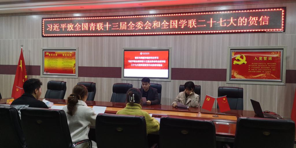 为深入学习贯彻习近平总书记贺信和党中央致词精神,全面贯彻落实全国学联二十七大提出的工作部署和任务,11月19日下午,云顶国际vip.888研究生召开学习习近平致全国青联十三届全委会和全国学联二十七大的贺信暨党中央致辞专题会。本次会议由研究生工作秘书陈楠主持,研究生分会工作人员参会。