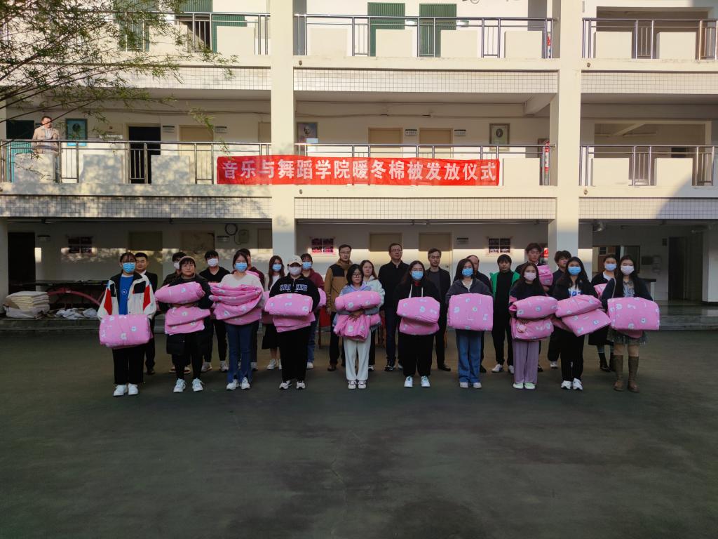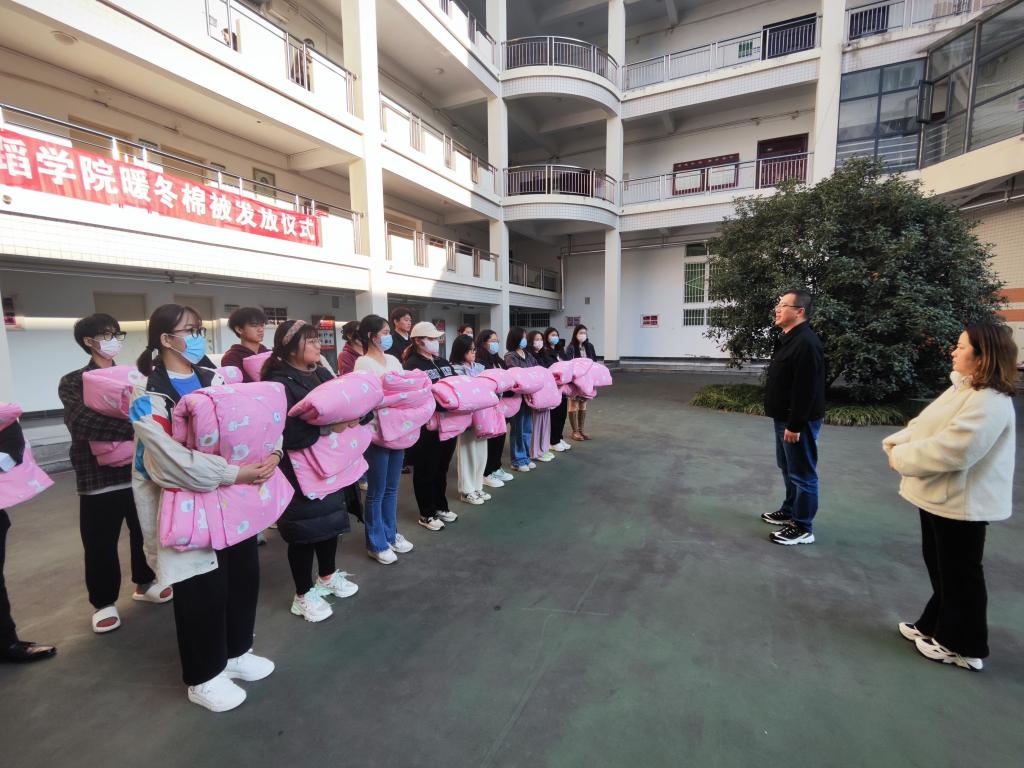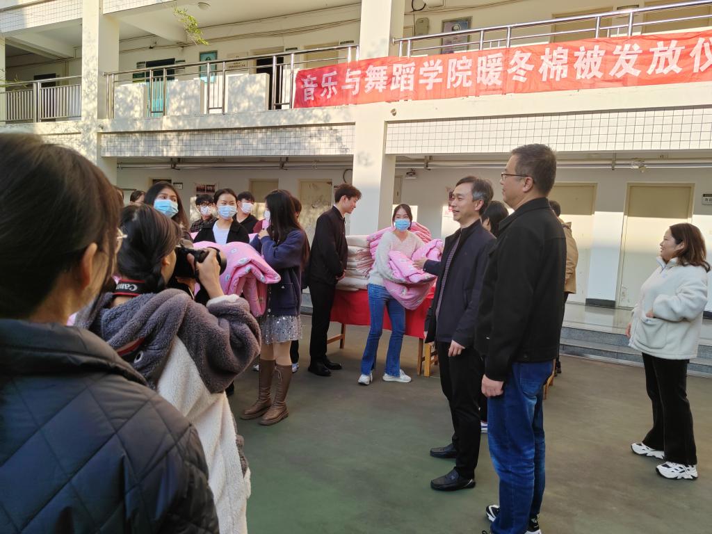 爱心棉被御寒冬,资助育人暖人心。11月25日,云顶国际vip.888在艺术楼举行冬日送温暖爱心棉被发放仪式,党委书记周文勇、经理陈新宇、副经理任远、副书记雷玲、公司辅导员、班主任为同学们发放爱心棉被。