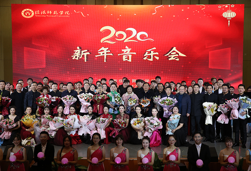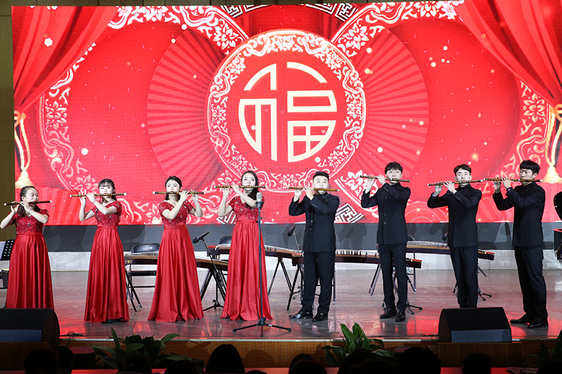 本场音乐会特邀河南歌舞演艺集团副总经理、演出总监、音乐总监、信阳师院客座教授杜宏亚担任艺术总监,涵盖了独唱、合唱、联唱、独奏、重奏、合奏等多种表演形式,精彩纷呈。音乐会在活泼欢快的笛子重奏《跑旱船》中拉开序幕,浓郁的地域特色营造了欢腾的节日氛围;男声联唱《祝酒歌》《我为祖国献石油》《双脚踏上幸福路》《我们走在大路上》唱出了师生敢于有梦、勇于追梦、勤于圆梦的豪情壮志以及昂首奋进的面貌;民乐作品《西域随想》《花梆子》《三六》旋律或明亮轻快、或曲韵悠扬、或昂扬激烈,用丝竹之韵、管弦之声奏响了中国气派的“赞歌”;管弦作品《新春乐》《良宵》展现出春日融融,鸟语花香的新春景象,赞美了今天的幸福生活;女声联唱《毛主席来到咱农庄》《我们的生活充满阳光》《年轻的朋友来相会》《在希望的田野上》热情讴歌祖国站起来、富起来、强起来的伟大进程;双钢琴《红旗颂》气势恢宏,表现了中国人民在党的指引下奋发向上的革命气概,讴歌了伟大祖国蒸蒸日上的繁荣景象;合唱《新的天地》唱出了祝愿祖国腾飞、民族复兴的共同心声,激励师生在把公司建设成高水平师范大学的追梦道路上不忘初心,矢志奋斗。音乐会结束后,校领导亲切慰问了全体演职人员。