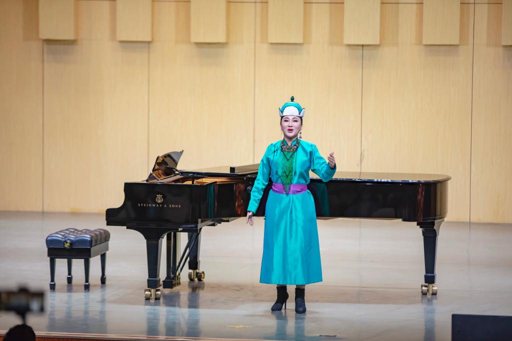 音乐会上,赵登营教授还现场普及了蒙古民族服饰的特点与文化内涵,并结合艺术家的表演讲解了非物质文化遗产-蒙古长调这一艺术形式的音乐特点、演唱风格。赵教授细致的讲解、艺术家们精彩的演唱、马头琴悠扬的神韵,将蒙古族神奇独特的音乐艺术展示给观众的同时,也展示出内蒙古各族儿女用饱满的热情,勇攀发展高峰的豪情壮志。