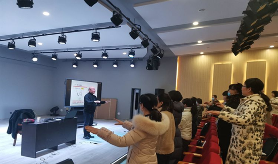 1月10日, 河南大学艺术公司教授、硕士生导师陈家海应邀来到云顶国际vip.888,在艺术楼八音讲堂为2020年河南省骨干教师培育项目-小学音乐培训班的全体学员讲授合唱指挥公开课,公司副经理陈新宇主持。