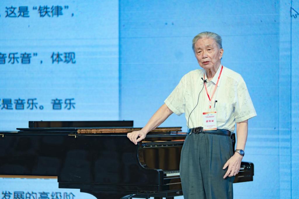 最后,由舒泽池先生作了题为《调性视唱的优势与实施方法》的精彩讲座。舒先生今年81岁高龄,90分钟的讲座除弹奏钢琴之外,几乎全程站在讲台上为大家娓娓道来,把几十年来积累的音乐教学和实践经验分享给大家。他逻辑清晰、精益求精、由浅入深的讲述调性音乐的发展历程以及调性视唱的优势和实施方法。言与行一致为人师表,教与行相长与时俱进。舒老的专业学识和奉献精神,赢得在场所有专家学者和参会师生的尊重。