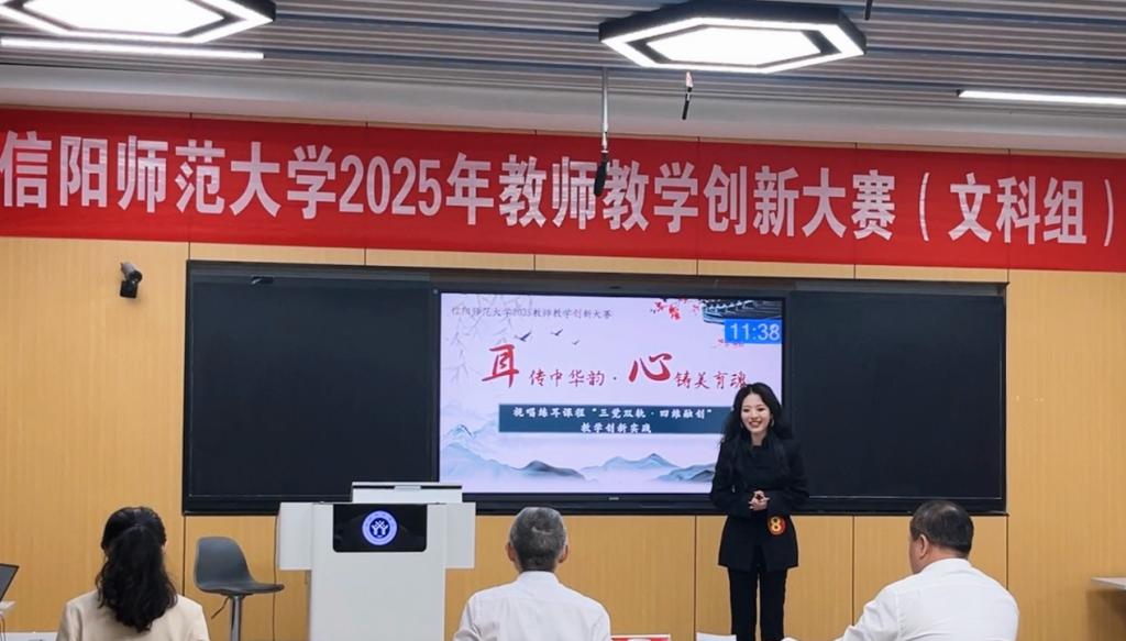 决赛现场,刘佳蕾老师从教学痛点分析、创新路径设计到改革成效验证,系统展示了《视唱练耳》课程的全方位革新。她生动呈现了员工从“基础薄弱”到“高阶思维显现”的成长轨迹,并重点阐释了课程思政与文化传承的深度融合。